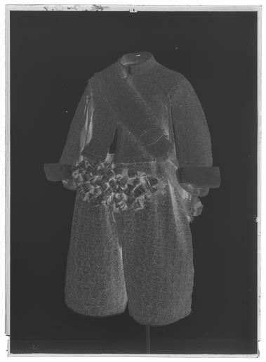 | Keywords: Tröja av guldlamé helt täckt av guldbroderi - Livrustkammaren - 10307-negative.tif LSH artwork sv Förmodligen tillverkad i Frankrike Buren av Karl X Gustav 1622-1660 i samband med kröningen <br/>I 1671 års inventarium står En Klädningh som är gjord till H K Maij tz Lÿcklige Cröningh och sägs omfatta följande plagg nämligen kappa tröja byxor knäband skorosor och handskar I 1654 års klädkammarräkning förtecknas dräkten under nr 3 på följande sätt 1 klädning och kappa av filemort gul oskuren sammet helt broderad med guld och med 140 diamantknappar till tröjan och byxorna 1 par strumpeband och skoband av rik guldbrokad helt broderade med guld 1 par underbyxor av incarnadie rosa taft och silkesstrumpor av samma färg 1 guldbroderat med guld och stofferade med guldbrokad 1 panasch plym av couleur de feu röda filemort och aurorafärgade fjädrar 1 par förgyllda sporrar och 1 värja med förgyllt fäste <br/>Nu finns endast tröjan och byxorna i behåll i sitt skick som dräkt medan den stora rundskurna kappan inte längre omtalas i inventarierna efter 1691 1704 års inv säger inget om kappan men den finns förvandlad till mässhake och altarbrun i Riddarsholmskyrkan Skänkta dit den 1 april 1705 av Riksänkedrottningen Hedvig Eleonora Mässhaken Gjord av tjock gul rips OBS Fel Enl Sveriges kyrkor skall vara sammet oskuren ett material som skiljer sig från såväl tröjans som byxornas Broderad med mönster i guld på samma sätt som på tröjan och byxorna Mönsterrapport 8 x 8 cm Såväl fram- som bakstycket består av 2 hopsydda våder av c a 40 cm bredd max längd ca 90 cm Drottningens namnchiffer HRS samt ANNO 1705 har broderats på respektive fram- och baksidorna <br/>Tröjan är sydd av vad man med ett modernt namn skulle beteckna som guldlamé som helt täckts med guldbroderi Den är av s k innocenttyp d v s ett relativt kort livplagg med planschetter inlagda som styvnad i framstyckenas snibbiga främre hörn försett med 10 små skört ståndkrage och relativt korta ärmar med öppna sömmar framtill På vänster framstycke har 17 st 2 cm knapphål sytts med jämna mellanrum ca 1 cm från kanten Vad man bör lägga märke till är att tröjan sytts av ett större antal stycken som skarvats samman Förmodligen har plagget antingen redan varit i tidigare bruk före kröningen 1654 och blivit något förtrångt eller också har man misslyckats med passformen vid tillfället i fråga och har varit tvungen att göra en del ändringar Möjligheten att tröjan kan ha förändrats vid något senare tillfälle kan man inte heller bortse ifrån <br/>Bottenmaterialet består nämligen av två skilda lamétyger ett något gulare i de smalare skarvarna och f ö ett något rödare det egentliga materialet Tröjan är huvudsakligen skuren i 2 framstycken 2 ryggstycken samt 2 ärmstycken till vardera ärmen 10 skört samt krage Man kan alltså visa att framstyckena måste skarvas med remsor av det gulare tyget utefter de raka framkanterna samt även i sidsömmen I halsringningen har en liten kil satts in mellan det vertikala skarvstycket fram och axelsömmen Bakstyckena ha fått var sin vertikala skarv knappt 4 cm bred mitt i ryggen på ömse sidor om mittsömmen Utefter ärmarnas öppna långsidor har vertikala stycken fogats till och nere vid ärmens avslutning har på undersidans stycken en smal horisontell remsa sytts På överärmstycket däremot har en horisontell skarv satts in överst uppe vid ärmringningen Kragen är också uppklippt baktill och försedd med 2 små skarvstycken Det 3 e skörtet på varje sida är eventuellt nysytt ty dess färg förefaller ljusare broderiet är klumpigare och kompositionen annorlunda mot alla de övriga 8 som exempelvis har den lilla blomman nedtill i mitten <br/>Mönstret har i någon mån missuppfattats i de senare sydda styckena så har man t ex lagt krepiner och trådar i båge i stället för att klippa av dem och börja med en ny tråd Ärmarnas nedersta parti mellan 3 5-7 cm är lämnat utan broderi beroende på att det ju skulle vikas till uppslag Ärmarna har inga knappar eller knapphål intill sprunden vid handlederna I midjan sitter på insidan under skörten 8 st små tampar med vardera 2 hål för byxornas hakar Guldlamén har en vådbredd av minst 31 cm utan stad 45x15 tr/cm2 Varje inslag består av gult silke med 2 och 2 smala trinda guldtenar på rätan <br/>Analysresultat <br/>Metalltråd tvinnad med textiltråd huvudbeståndsdelar <br/>Silver xxx<br/>Guld x<br/>Koppar xxx<br/>Zink 0<br/>Det yttäckande läggsömsbroderiet består av kantiljer av trinda tenar och platta lan av olika bredd snodder med silkeskärna omtvinnade med guldlan strängar dragna av trinda tenar av guld eller silver som stansats ut i spiraler eller öglor och manglats platta på halva sidan här benämnda spiral- eller paljett strängar i brist på befintlig terminologi och 2 och 2 tätt liggande strängar med trinda smala guldtenar virade runt ett bredare guldanklätt snöre etc Broderiet är nersytt med gult silke Mönsterraporten är 6 5x6 5 cm Mönstret Ur 2 från varandra utåtböjda palmkvistar som strax nedanför mitten sammanhålles med en uppåtböjd båge växa omväxlande 5- och 8-flikiga icke naturalistiska blommor upp <br/>Analysresultat <br/>Metalltrådsbroderi huvudbeståndsdelar <br/>Silver xxx<br/>Guld xxx<br/>Koppar xxx<br/>Zink 0<br/>Tröjan är garnerad med en 2 3 cm bred knypplad uddspets av guldtråd med 2 inlagda guldlan Mönsterrapporten är c a 2 5 cm Spetsen sitter på bägge främre ytterkanterna knapparna har alltså suttit ovanpå spetsen och fortsätter därifrån omedelbart runt de 2 främre skörten Vidare sitter det spets runt de 3 ytterkanterna av varje skört på axel-och sidsömmarna runt ärmhålen och längs de öppna ärmsömmarna sprunden Den ursprungliga knäppningen finns inte längre kvar diamantknapparna lät änkedrottningen ta ur och använda för annat ändamål Numera knäppes trö