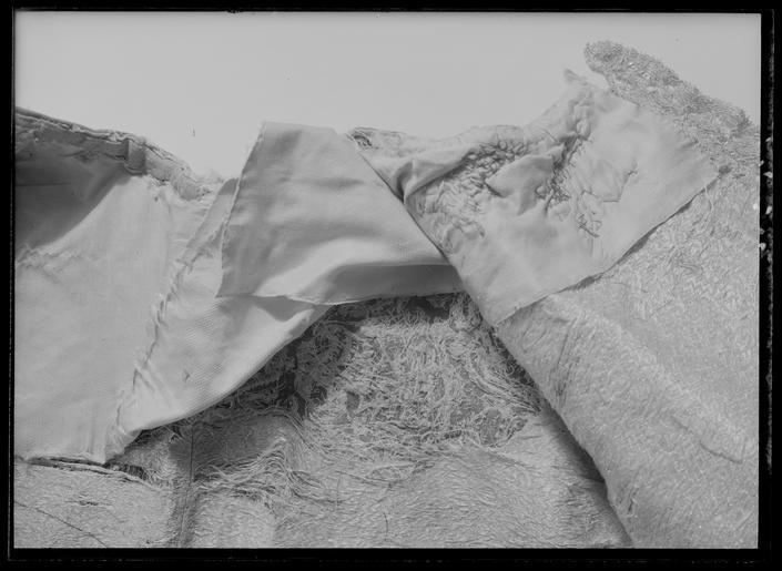 | Keywords: Tröja av mönstrad silverbrokad, ca 1650-1660 - Livrustkammaren - 70202.tif LSH artwork sv Buren av Karl X Gustav 1622-1660 vid kröningen 1654-06-06 okänd tillverkare <br/>Tröja Livplagg av innocenttyp Skuren i 2 lika stora framstycken vars framkanter följer staden 1 helt bakstycke 1 ståndkrage 10 små skört samt 2 svängda stycken för varje ärm Plagget är sytt av rik silverbrokad och har även foder av silverbrokad i annat mönster Tröjan är försedd med mellanfoder av linnelärft 20x19 tr/cm2 och planschetter triangelformade styvnader nedtill i de spetsiga framkanterna Kragen är på insidan fodrad med vitt mönstrat siden av samma sort som återkommer i tröjan till dräkt nr 3401 och har mellanfoder av linnelärft 25x21 tr/cm2 med inlagd styvnad troligen fiskben Vänsterframstycke har 21 knapphål för de bevarade 21 knapparna i höger framstycke Knapphålen är sydda med vitt högertvinnat silke 8 stygn/cm över 1 tråd Knapparna d 1 3 cm är med silverlansomspunnet vitt högertvinnat silke trind kantilj och silverlan Tre stycken likadana knappar sitter i kragen men motsvarande tränsar saknas <br/>Silverbrokaden som utgör tröjans övertyg benämnes rik silverduk Den kan beskrivas på följande sätt Vådbredd minst 50 cm 72x18 tr/cm2 Varp av tunt vitt otvinnat silke De grövre otvinnade vita inslagstrådarna bildar dels botten med silverlan i varje inslag dels blommönster av flotterade trådar med högertvinnade silverlan i varje sådant inslag Stad 1 cm 10 gröna 4 orange 12 gröna 1 vit tråd Mönsterrapport 8 8 x 8 8 cm Mönstret är symmetriskt uppbyggt med halvnaturalistiska blommor sammanhållna i rosettlika arrangemang Ärmarna är avsedda att ha den främre sömmen öppen På de motsatta bakre sömmarna har ärmarna sprund nedtill vid handleden Man har avsett att vika upp ärmensnederkant till uppslag Förutom de 10 trapetsformade skörten sitta i midjan på tröjansinsida 7 st stroppar klädda med foderbrokaden vardera med 2 hål för de 7 silverhakarna ibyxlinningen 4 sitter på den vänstra sidan och 3 på den högra Silverbrokaden som utgörtröjans foder benämnes också i de äldre inventarierna silverduk <br/>Denna har en vådbredd av minst 51 cm c a 70 x 18 á 19 tr/cm2 Mycket tunn och tät varp avvita otvinnade silkestrådar där dessa bildar botteninslag ha de försetts med silverlan pårätan De flotterande mönstertrådarna är däremot endast av vitt silke Ripsvävnad Stad 0 8 cm 12 gröna 4 gulorange 10 gröna 1 tjockare vit tråd - vävnad i tuskaft Mönsterrapport h 7 7 cm b 6 6 cm Det är ett halvnaturalistiskt blomstermönster med enkarakteristisk figur som erinrar om en fjäder Samma silverbrokad återkommer som foder itröjan nr 3389 All garnering och dekor av spetsar har sprättats bort och tröjans foder harskadats upptill Kragen har även brännskada vilket tyder på att den lämnats till utbrännning På kragens insida har man med bläck märkt plagget N 43 en åtgärd somstammar från 1789 original caption Karl X Gustavs kröning < 1654 brocade d1 - dräkt - yttermaterial material silverbrokad - linen - silk Färg vit material siden - silk Färg vit material silke - silver - silver - brocade d1 - dräkt - yttermaterial material silverbrokad LRK Karl X Gustav av Sverige Gallica 1945 Sweden - A Royal Treasury 1988-1989 Slottet brinner 1997 1648 Westfaliska freden 1998 Modelejon 2002 Les arts décoratifs sous Louis XIII 2002 Sweden and Europe 1632-1792 2003-2004 Silver - Makt o prakt i barockens Sverige 2003-2004 place of origin original filename LN_B14288_017168 67897 inventory number LRK 31304 70202 CC0 Tröja av mönstrad silverbrokad ca 1650-1660 - Livrustkammaren - 70202-negative tif <gallery caption Different images of same object > File Tröja av mönstrad silverbrokad ca 1650-1660 - Livrustkammaren - 18866 tif File Tröja av mönstrad silverbrokad ca 1650-1660 - Livrustkammaren - 10303 tif File Dräkt i rött och silvertyg som tillhört Karl X Gustav - Livrustkammaren - 65159 tif File Tröja av mönstrad silverbrokad ca 1650-1660 - Livrustkammaren - 70230 tif File Tröja av mönstrad silverbrokad ca 1650-1660 - Livrustkammaren - 78761 tif File Tröja av mönstrad silverbrokad ca 1650-1660 - Livrustkammaren - 53091 tif File Tröja av mönstrad silverbrokad ca 1650-1660 - Livrustkammaren - 61640 tif File Tröja av mönstrad silverbrokad ca 1650-1660 - Livrustkammaren - 35972 tif File Tröja av mönstrad silverbrokad ca 1650-1660 - Livrustkammaren - 78789 tif File Dräkt i rött och silvertyg som tillhört Karl X Gustav - Livrustkammaren - 73721 tif File Tröja av mönstrad silverbrokad ca 1650-1660 - Livrustkammaren - 10304 tif File Dräkt i rött och silvertyg som tillhört Karl X Gustav - Livrustkammaren - 56598 tif File Tröja av mönstrad silverbrokad ca 1650-1660 - Livrustkammaren - 1744 tif File Tröja av mönstrad silverbrokad ca 1650-1660 - Livrustkammaren - 44530 tif </gallery> Coronation of Charles X of Sweden Shirts Media contributed by LSH 2014-11 |