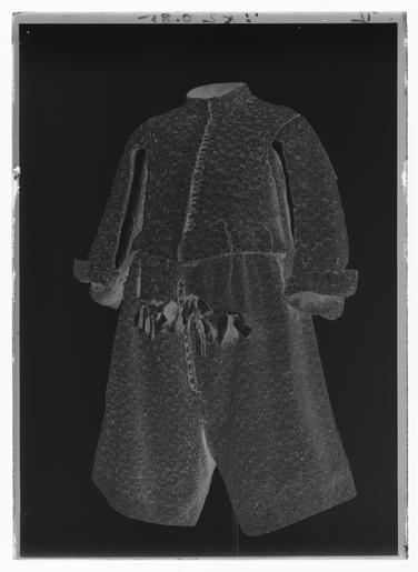 | Keywords: Tröja av svart atlas, 1650-tal - Livrustkammaren - 52705-negative.tif Detta är en dräkt som man mycket gärna skulle vilja sätta i samband med Karl X Gustavs kröning men det finns ännu inget dokumentariskt bevis för detta dräkten ingår ev i fransyska varorna Det är en synnerligen rikt utstyrd dräkt och den har såväl i sitt broderi som i sin foder brokad en ovanligt hög guldhalt I 1671 års inventarium sägs det att dräkten utgörs av kappa tröja byxor knäband skorosor och handskar Allt av svart atlas med Gull heelöfwer borderat Numera är tyvärr dräkten inte längre så fullständig både 1671 och 1676 års inventarier vittnar visserligen om kappans existens men därefter är den försvunnen man hade redan 1671 tagit bort spetsarna av guld och 20 år senare omtalas kappan ej längre Nuvarande inventarium omtalar blott tröja byxor och 1 handske Under ett annat inventarienummer 3435 har emellertid kunnat identifieras ett dräkttillbehör nämligen ett gehäng med samma broderi Den svarta atlasen har en vådbredd av ca 53 cm utan stad Staden är 1 3 cm bred 10 gröna 10 vita 10 gröna 10 vita 10 gröna samt 5 tjocka svarta trådar - tuskaft Trådarnas antal kan variera Det hela ytan täckande broderiet är utfört i läggsöm och har en mönsterrapport av h 10 cm b 6 8 cm Det är utfört med olika sorters guldkantiljer samt paljettsträngar Längs en del kantsömmar har man sytt på ett smalt guldsnöre bestående av en tvinnad tråd omspunnen med lan Broderiet är nersytt med vitt och gult silke samt tjockare rosa lintråd <br/><br/>Analysresultat Tråd och lan av legerat guld huvudbeståndsdelar <br/>Silver xx<br/>Guld xxx<br/>Koppar xxx<br/>Zink 0<br/><br/>Mönstret är ett stiliserat blomstermönster där ett ringformigt omtag snarast utvecklats till en krona som utdragna klockliknande blomkalkar vända sig till eller ifrån I plaggen kan man observera att broderiet uppvisar olika kvaliteter och här kan även spåras skarvar i tyget underlaget De tillskurna bitarna uppvisa en klumpigare torrare karaktär i broderiets utförande samt smärre avvikelser från det gängse utförandet Så t ex har i tröjan den lilla 5-bladiga blomman ovanför kronan sitt översta mellersta blad sytt med horisontella kantiljer istället för vertikala som det borde varit Mönstret är också gyttrigare och oredigare Kronans tinnar är omramade av i öglor lagda konturtrådar och ej som i det ursprungliga broderiet där konturen går upp och ned <br/>Mönsterrapport ca h 77 mm b 58 mm Tröjan av innocenttyp är sydd med 2 framstycken som utökats såväl upptill på axelpartiet som utefter ärmringningen och längs sidosömmen med tillsatta bitar I ryggen har skarvstyckena infogats längs en mittsöm ursprungligen kunde ryggstycket ha varit helt Nu ligger emellertid på ömse sidor mittsömmen en smal blott 1 5 cm bred skarv Likaså har man även baktill gjort tröjan något längre genom skarvar utefter axel- och halsringningarna Ärmarna har bara utvidgats obetydligt genom en skarvad remsa utefter underärmstyckets bakre övre del samt på bägge styckena nertill utefter ytterkantens söm ärmsprundets sida ca 27 cm Kragen har klippts upp på samma sätt som ryggstycket så att intill mittsömmen 2 små skarvstycken ligga på ömse sidor synbarligen även placerade upp- och nedvända Tröjan har 10 skört och i midjesömmen sitta på insidan 8 st byxtampar vardera med 2 hål Fodret utgöres av guldbrokad med svart botten Det har en vådbredd av minst 47 cm ev ca52 x 14 á 15 tr/cm2 Det är en ripsvävnad med varp av svart otvinnat silke Inslagen är 14 st med gult silke högertvinnad med guldlan samt 14 st med gult silke högertvinnad med guldlan samt 14 st svarta med guldlan på rätan Stad ca 1 3 cm 8 gröna 9 vita 12 gröna 8 vita 11 gröna 6 svarta trådar - de färgade i atlasbindning de svarta i lärftsbindning Mönsterrapport h 7 7 cm b 5 8 Mönstret består av halvnaturalistiska små blomsterkvistar <br/><br/>Analysresultat Metalltråd tvinnad med textiltråd huvudbeståndsdelar <br/>Silver xxx<br/>Guld xx<br/>Koppar xx<br/>Zink 0<br/><br/>Då fodret är mycket trasigt och slitet har man fodrat in kragen och den övre delen av tröjan med svart taft Skörten som ju också är fodrade med brokaden har fått bitar av denna på varierande led Man har givetvis velat utnyttja det dyrbara materialet till fullo I framkanten på vänster sida har tröjan en knapphålsrad med 23 knapphål 2 cm långa På motstående sida finns 22 knappar i behåll de är 1 2 cm i diameter Knapphålsraden är på undersidan fodrad med guldbrokad av samma typ som finns i byxornas fickor Nertill i framstyckena finns planschetter som når t o m det 13 e knapphålet eller är ca 22 cm långa Dessa är klädda med något grövre linnelärft än den oblekta linnelärft som utgör mellanfoder i tröjan 23x18 tr/cm2 Det finns 3 knappar med tränsar i ståndkragen Knapparna är överklädda med olika guldtrådar lan och kantiljer I midjan på tröjan har man mellan fodren lagt en avklippt stadremsa vävd randig i gult och orange med svart som ev är en avklippt stad från någon annan dräkts tyg ev den oskurna svarta sammetsdräkten nr 3421 Detta för att ge mera styrsel åt plagget Att man klippt till plaggets olika delar och beräknat sömmarnas placering innan man broderat dem visar bl a ärmarnas nedre parti som på den broderade sidan ju skulle vikas till uppslag De har alltså ej behövt broderas ända ned utan man har lämnat den svarta atlasen bar på ett knappt 10 cm brett stycke Blott mitt fram på högra sidan under knappraden finns en knypplad ca 1 7 cm bred guldspets med guldlan kvar original caption Karl X Gustavs kröning Kristinas kröning Karl X Gustav och Hedvig Eleonoras bröllop 1647 LRK Karl X Gustav av Sverige Modelejon 2002 place of origin original filename LN_B10546_013426 55955 inventory number LRK 19340 52705 CC0 Tröja av svart atlas 1650-tal - Livrustkammaren - 52705 tif 