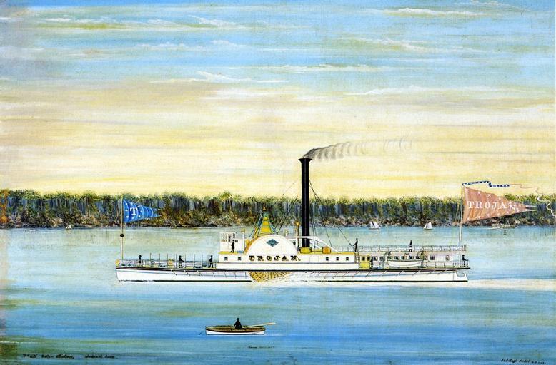 | Keywords: Trojan (steamboat 1845) by Bard Bros.jpg en Trojan Hudson River steamboat oil on canvas by James and John Bard http //www the-athenaeum org/ The Athenaeum org James Bard 1815-1897 and John Bard 1815-1856 1845 Original in Mariners' Museum at Newport News VA as of 1997 Also reproduced Mariner's Museum and Peluso Anthony J Jr The Bard Brothers -- Painting America under Steam and Sail Abrams New York 1997 ISBN 0-8109-1240-6 PD-Art James Bard 1841-1850 works Steamboats of the Hudson River Images from the-athenaeum org |