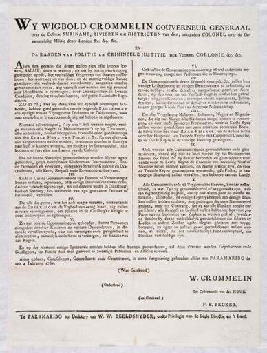 | Keywords: Tropenmuseum Royal Tropical Institute Objectnumber 0-459 Gedrukte bepaling betreffende het vrijla.jpg en Printed document concerning the emancipation of slaves nl Document Gedrukte bepaling van de Nederlandse overheid over het vrijlaten van slaven opgesteld op 4 februari 1761 te Paramaribo De bepaling is uitgegeven namens de gouverneur-generaal Wigbold Crommelin en de Raaden van Politie en Crimineele Justitie der voorsz Collonie c Het besluit bevat een reglement om de 'meenigvuldig kwaade gevolgen' van het vrijlaten van slaven te beperken Een korte samenvatting van de regels in deze 1 Niemand mag een slaaf vrijmaken manumiteren zonder toestemming van de politie De aanvraag zal niet worden toegekend als niet wordt bewezen dat de ex-slaaf zelf de kost kan winnen en dus niet ten laste van de kolonie komt te vervallen 2 De gemanumitteerden evenals zijn of haar nakomelingen moeten altijd respect en 'reverentie bewijzen' aan hun voormalige eigenaar en zijn familie 3 Mocht de vrije slaaf zijn voormalige eigenaar kwaad doen dan komt hij weer in dienst van deze en zijn vrouw 4 De ex-slaaf moet in de Christelijke religie zijn opgevoed 5 de gemanumiteerde moet zijn voormalige eigenaar en familie indien deze tot armoede vervallen in onderhoud verzorgen naar oordeel van een rechter 6 ex-slaven mogen trouwen doch niet met slaven 7 de nakomelingen van gemanumiteerden hebben recht op de erfenis bij sterfte; een vierde deel gaat naar de voormalige eigenaar of zijn kinderen 8 vrijgelaten Mulatten Indianen Negers en Negerinnen die zich vermengen met slaven en waaruit kinderen voortkomen moeten eerst een boete betalen; de tweede overtreding bestaat uit lijfstraf en de derde uit een terugkeer naar slavernij 9 een gemanumiteerde mag zich niet bij slavendansen ophouden op straffe waarvan ze de executie van een slaaf of slavin moeten aanzien Als tweede straf wordt hij of zij terug in slavernij gebracht 10 elke vrijgemaakte slaaf moet ten alle tijde respect en eerbied tonen aan alle blanken Hoewel zij in andere gevallen gelijke rechten hebben als vrijgeborenen dienen voormalige slaven dank voor hun vrijheid te tonen en anders worden zij gestraft Gedrukte bepaling betreffende het vrijlaten van slaven 1761-02-04 institution Tropenmuseum KIT-source 0-459 author KIT-license PD-old-100 Slavery in Suriname |
