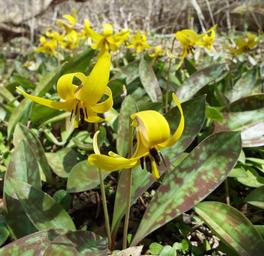Keywords: wildflower wildflowers yellow speckled variegated spring forest ontario outdoor flower plant Carpet of trout lilies in Ontario forest Carpet of trout lilies in Ontario forest