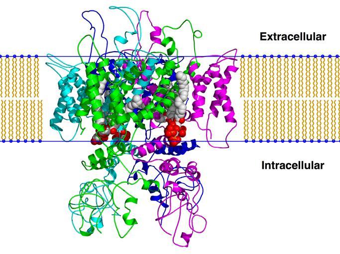| Keywords: Trpv1 pip2 bilayer.png en Created using PyMol and a homology model of the TRPV1 ion channel based on a homology model published in cite journal Brauchi S Orta G Mascayano C Salazar M Raddatz N Urbina H Rosenmann E Gonzalez-Nilo F Latorre R Dissection of the components for PIP2 activation and thermosensation in TRP channels Proceedings of the National Academy of Sciences of the United States of America 104 24 10246 “51 2007 June 17548815 1891241 10 1073/pnas 0703420104 Own Boghog2 2008-11-02 Protein structures Ion channels |