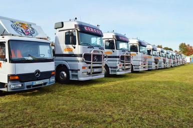 Keywords: truck parking semi trailers circus on tour towing vehicles front view