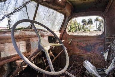 | Keywords: truck transport vehicle traffic commercial vehicle auto historically vice usa america north america united states carol m highsmith rusted old scrap rarity vintage car oldtimer automotive transporter old truck pickup napa valley california steering wheel interior |