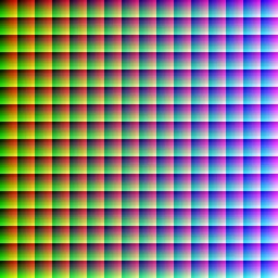 | Keywords: True colour.PNG en Full true colour 24-bit RGB palette The red shade changes by 1 across the y-axis the green shade changes by 1 across the x-axis and the blue changes by 1 in each new 256 256 block There is a total of 256 256 256 or 16 777 216 colours The final 4096 4096 image was too large to make all at once in Java the virtual machine reports java lang OutOfMemoryError Java heap space so I made this by splitting it into four different sections top left top right bottom left and bottom right and combining them in MS paint The program to make such a simple image is therefore pretty complex and requires 8 classes to make it work own 06 57 21 May 2010 UTC Simpsons contributor talk Simpsons contributor en Original upload log en wikipedia FtCG page en wikipedia True_colour PNG wikitable - 00 47 29 September 2012 4 096 × 4 096 56 030 bytes DMahalko w en <nowiki> Reverted to version as of 04 51 18 June 2012 - Size reduction to 2048x2048 results in a non-accurate image Image size must remain 4096x4096 to encompass all 16 777 216 colors of the 24-bit palette If you want a smaller inaccurate substitute upload </nowiki> - 20 10 13 August 2012 2 048 × 2 048 51 899 bytes Ronhjones w en <nowiki> Image display issue cannot be fixed by optimisation - it's just too many pixels the only way to display is to do a 2 into 1 reduction </nowiki> - 04 51 18 June 2012 4 096 × 4 096 56 030 bytes Julyo w en <nowiki> Optimized filesize with OptiPNG PNGOUT AdvPNG and DeflOpt; most optimization resulted from reducing colorspace from 32-bit RGBA to 24-bit RGB </nowiki> - 14 43 21 May 2010 4 096 × 4 096 23 227 397 bytes Simpsons contributor w en <nowiki> </nowiki> - 06 57 21 May 2010 4 096 × 4 096 23 261 227 bytes Simpsons contributor w en <nowiki> Full true colour 24-bit RGB palette The red shade changes by 1 across the y-axis the green shade changes by 1 across the x-axis and the blue changes by 1 in each new 256 256 block There is a total of 256 256 256 or 1 </nowiki> RGB |
