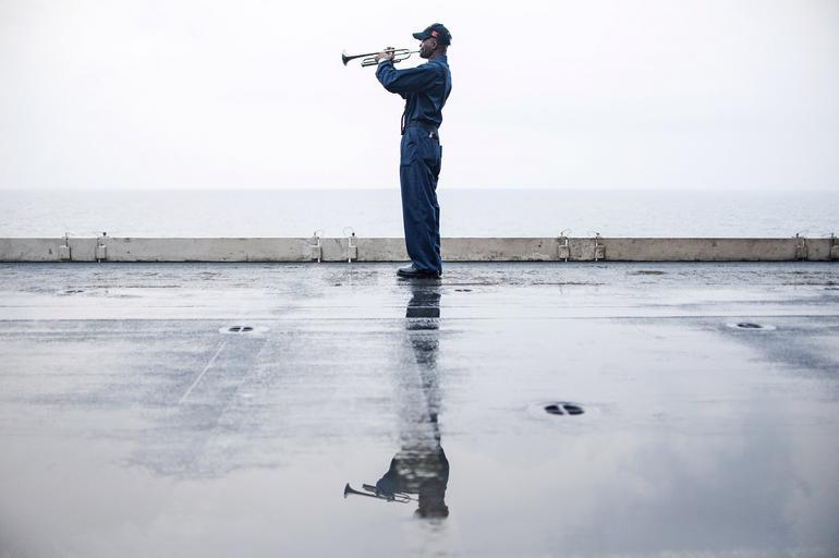 Keywords: trumpeter sailor silhouette trumpet horn brass military navy duty sunset water sea ocean instrument commemorate tribute special occasion taps usa
