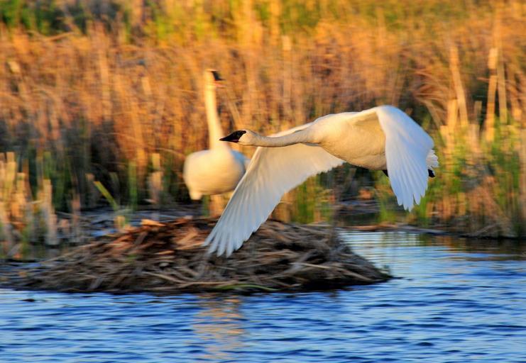 Keywords: trumpeter swans birds wildlife nature cygnus flying flight outdoors waterfowl grass reeds wings water