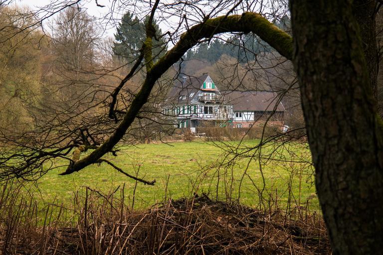 Keywords: truss home fachwerkhaus hof mill bergisches land valley eifgenbachtal eifgen creek building facade architecture forest meadow tree road branch hauswand