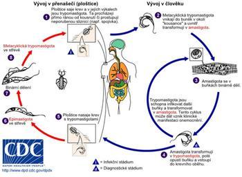 Keywords: Trypanosoma cruzi LifeCycle cs.png Životnà cyklus T cruzi Trypanosomiasis American Trypanosoma cruzi An infected triatomine insect vector or kissing bug takes a blood meal and releases trypomastigotes in its feces near the site of the bite wound Trypomastigotes enter the host through the wound or through intact mucosal membranes such as the conjunctiva Common triatomine vector species for trypanosomiasis belong to the genera Triatoma Rhodinius and Panstrongylus Inside the host the trypomastigotes invade cells where they differentiate into intracellular amastigotes The amastigotes multiply by binary fission and differentiate into trypomastigotes and then are released into the circulation as bloodstream trypomastigotes Trypomastigotes infect cells from a variety of tissues and transform into intracellular amastigotes in new infection sites Clinical manifestations can result from this infective cycle The bloodstream trypomastigotes do not replicate different from the African trypanosomes Replication resumes only when the parasites enter another cell or are ingested by another vector The kissing bug becomes infected by feeding on human or animal blood that contains circulating parasites The ingested trypomastigotes transform into epimastigotes in the vector ™s midgut The parasites multiply and differentiate in the midgut and differentiate into infective metacyclic trypomastigotes in the hindgut Trypanosoma cruzi can also be transmitted through blood transfusions organ transplantation transplacentally and in laboratory accidents Trypanosoma_cruzi_LifeCycle gif 2011-11-18 19 04 UTC Trypanosoma_cruzi_LifeCycle gif DPD CDC derivative work Icewalker cs <span class signature-talk >talk</span> Czech translation Icewalker_cs Trypanosoma_cruzi_LifeCycle gif PD-USGov Original upload log This image is a derivative work of the following images File Trypanosoma_cruzi_LifeCycle gif licensed with PD-USGov 2006-04-29T12 22 27Z Patho 594x435 47330 Bytes <nowiki> Trypanosomiasis American Trypanosoma cruzi An infected triatomine insect vector or kissing bug takes a blood meal and releases trypomastigotes in its feces near the site of the bite w</nowiki> Uploaded with derivativeFX Trypanosoma c life cycle CDC lifecycles |
