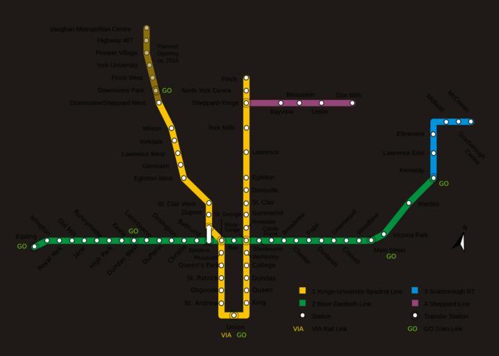 Keywords: TTCsubwayRTmap-2007.svg Map of TTC Subway in Toronto Based off of http //www3 ttc ca/Subway/interactivemap jsp this Own 2007-12-08 Paulshannon Toronto subway and RT maps