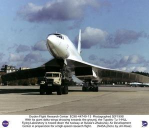Keywords: Tu-144LL SST Flying Laboratory Being Towed Down Taxiway DVIDS694138.jpg en With its giant delta wings drooping toward the ground the Tupolev Tu-144LL is towed down a taxiway at the Zhukovsky Air Development Center near Moscow Russia in preparation for a high-speed research flight in 1998 NASA teamed with American and Russian aerospace industries for an extended period in a joint international research program featuring the Russian-built Tu-144LL supersonic aircraft The object of the program was to develop technologies for a proposed future second-generation supersonic airliner to be developed in the 21st Century The aircraft's initial flight phase began in June 1996 and concluded in February 1998 after 19 research flights A shorter follow-on program involving seven flights began in September 1998 and concluded in April 1999 All flights were conducted in Russia from Tupolev's facility at the Zhukovsky Air Development Center near Moscow The centerpiece of the research program was the Tu 144LL a first-generation Russian supersonic jetliner that was modified by its developer/builder Tupolev ANTK aviatsionnyy nauchno-tekhnicheskiy kompleks-roughly aviation technical complex into a flying laboratory for supersonic research Using the Tu-144LL to conduct flight research experiments researchers compared full-scale supersonic aircraft flight data with results from models in wind tunnels computer-aided techniques and other flight tests The experiments provided unique aerodynamic structures acoustics and operating environment data on supersonic passenger aircraft Data collected from the research program was being used to develop the technology base for a proposed future American-built supersonic jetliner Although actual development of such an advanced supersonic transport SST is currently on hold commercial aviation experts estimate that a market for up to 500 such aircraft could develop by the third decade of the 21st Century The Tu-144LL used in the NASA-sponsored research program was a D model with different engines than were used in production-model aircraft Fifty experiments were proposed for the program and eight were selected including six flight and two ground engine tests The flight experiments included studies of the aircraft's exterior surface internal structure engine temperatures boundary-layer airflow the wing's ground-effect characteristics interior and exterior noise handling qualities in various flight profiles and in-flight structural flexibility The ground tests studied the effect of air inlet structures on airflow entering the engine and the effect on engine performance when supersonic shock waves rapidly change position in the engine air inlet A second phase of testing further studied the original six in-flight experiments with additional instrumentation installed to assist in data acquisition and analysis A new experiment aimed at measuring the in-flight deflections of the wing and fuselage was also conducted American-supplied transducers and sensors were installed to measure nose boom pressures angle of attack and sideslip angles with increased accuracy Two NASA pilots Robert Rivers of Langley Research Center Hampton Virginia and Gordon Fullerton from Dryden Flight Research Center Edwards California assessed the aircraft's handling at subsonic and supersonic speeds during three flight tests in September 1998 The program concluded after four more data-collection flights in the spring of 1999 The Tu-144LL model had new Kuznetsov NK-321 turbofan engines rated at more than 55 000 pounds of thrust in full afterburner The aircraft is 215 feet 6 inches long and 42 feet 2 inches high with a wingspan of 94 feet 6 inches The aircraft is constructed mostly of light aluminum alloy with titanium and stainless steel on the leading edges elevons rudder and the under-surface of the rear fuselage NASA Identifier NIX-EC98-44749-15 2009-09-23 Glenn Research Center https //www dvidshub net/image/694138 694138 2012-10-10 13 13 WASHINGTON DC US PD-USGov Langley Research Center Images from DoD uploaded by Fæ |