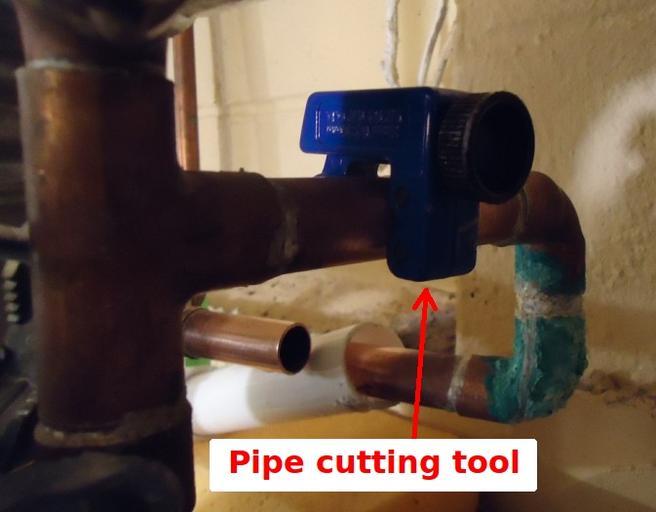 Keywords: Tube cutter cutting three fourths inch copper pipe.jpg en A tube cutter rotates around the copper pipe digging deeper after every couple of spins until the three quarter inch copper pipe is cut 2012-08-08 own Tomwsulcer cc-zero Uploaded with UploadWizard Plumbing tools Handyman projects Copper pipes |