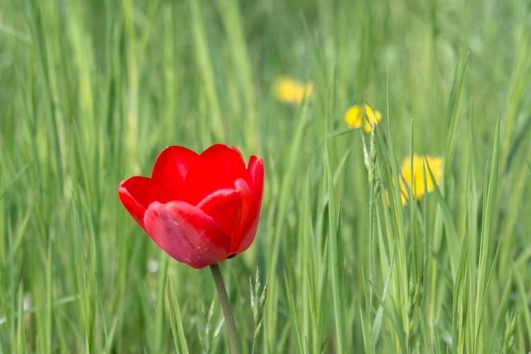 Keywords: tulip blossom bloom spring flower red plant early bloomer close grass meadow bed