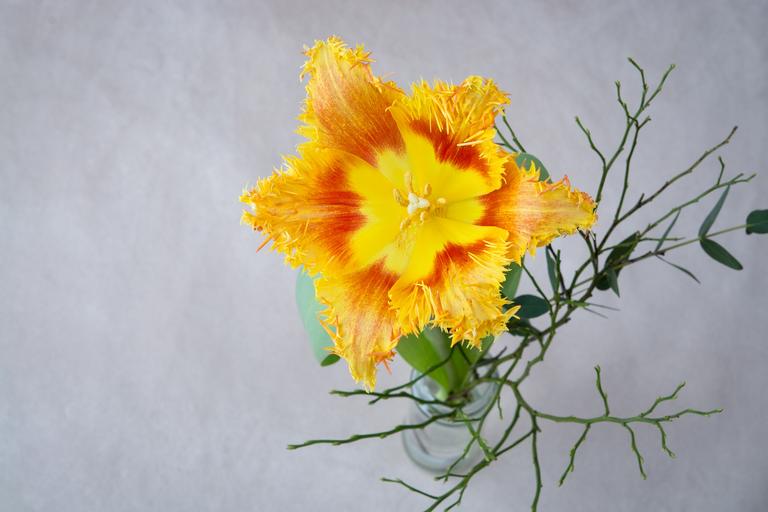 Keywords: tulip flower orange yellow red vase from above spring flower schnittblume blossom bloom close text freedom