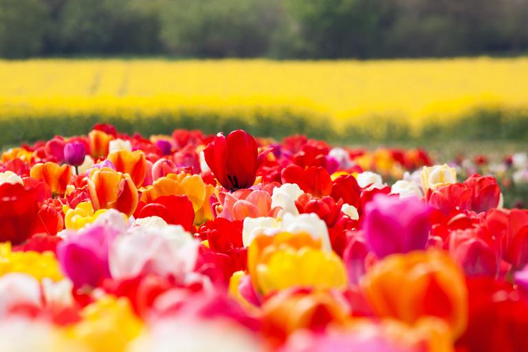 Keywords: tulip spring flower flower blossom bloom yellow red white pink violet leaf plant field arable field of rapeseeds spring may