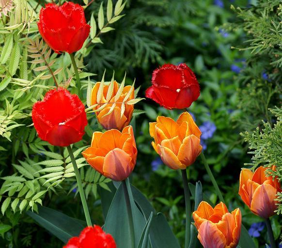 Keywords: tulips flowers red orange the blossoming of flowering chalices of flowers jagged tulip spring nature flora closeup garden flowers the background thuja the stems