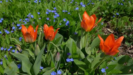 Keywords: tulips spring red green planting onion flowers forget me not bed garden nature