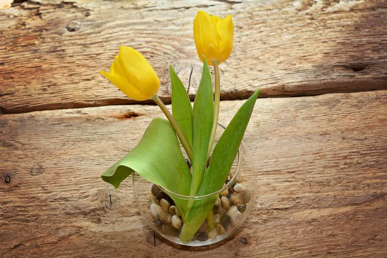 Keywords: tulips yellow flower blossom bloom yellow flower spring flowers schnittblume wood glass vase decorative stones spring