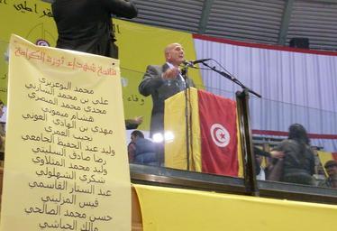 Keywords: Tunisie PDP 03.jpg fr Ahmed Najib Chebbi dans un meeting du Parti démocrate progressiste à Tunis own M Rais 2011-01-29 Cc-zero Ahmed Nejib Chebbi People with flags of Tunisia Banners in Tunisia Arabic inscriptions in Tunisia Sports Palace of El Menzah |