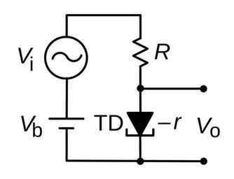 Keywords: Tunnel diode amplifier.svg tunnel diode can amplify a signal using negative differential resistance The DC voltage V<sub>b</sub> biases the tunnel diode TD into its negative resistance region and also supplies the power used in amplifying the signal For stability the resistor R must be less than the diodes negative resistance r Therefore the total resistance of both devices in series r - R is a small negative value Therefore a small increase in the input voltage V<sub>i</sub> causes a large decrease in the current causing a large increase in the voltage across the diode Using the equation for a voltage divider the AC output voltage is <math>V_o \frac r r - R V_i \ </math><br /> Since the denominator is smaller than the numerator the circuit has positive gain<br /> <math>G \frac r r - R \ </math><br /> 2012-09-27 08 59 10 own Chetvorno cc-zero Uploaded with UploadWizard Tunnel diode diagrams Negative resistance Resistor schemas |