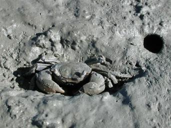Keywords: Tunnelling mud crab.jpg Tunnelling mud crab in Nelson Haven 3cm in diameter including legs Own 2011-10-09 Pseudopanax wikipedia en Austrohelice crassa