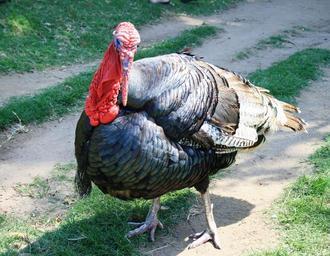 Keywords: turkey fowl poultry farm grey feathers shiny bird heavy gobbler red caruncles snood