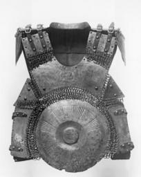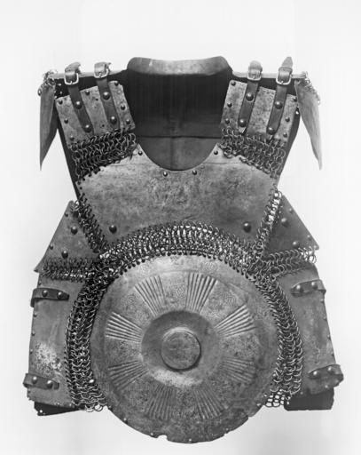 Keywords: Turkish - Body Armor - Walters 51419.jpg This is a reconstructed portion of a full suit of armor that a Turkish soldier would have worn into battle The chain mail that links the circular breast- and backplates to the steel plates at the sides and shoulders would have continued down over the warrior's forearms and connected with plate coverings that provided further protection from elbow to wrist The leather straps are modern replacements for sections of mail The soldier also might have been equipped with plate leg guards or with a long skirt or trousers made of mail and reinforced with additional steel plates The decoration of the plates features floral motifs Arabic inscriptions on the back and interlaced patterns-decorative elements used throughout the history of Islamic art century 16 Early Modern steel and leather modern cm 49 5 34 6 28 6 accession number 51 419 6012 Arsenal of Constantinople Dikran Kelekian New York and Paris date and mode of acquisition unknown Henry Walters city Baltimore Walters Art Museum Henry Walters Acquired by Henry Walters 1911 Again Arms and Armor Baltimore Museum of Art Baltimore 1940 place of origin Turkey Walters Art Museum license Indo-Persian armour in the Walters Art Museum Armour of the Ottoman Empire Islamic metalwork in the Walters Art Museum Art from Turkey 16th-century armour Krug |