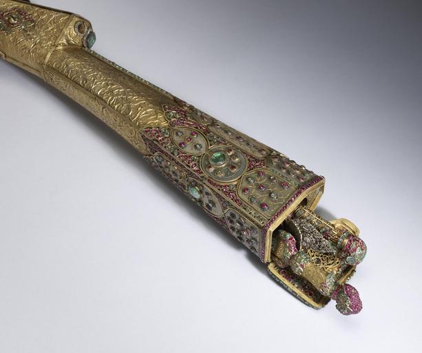 Keywords: Turkish - Rifle - Walters 5184 - Detail B.jpg Referencing the elite pastimes of hunting and writing this ceremonial jeweled rifle set includes a dagger pen case penholder with pen penknife cleaner and a spoon-all conveniently housed within the rifle butt Penknives were important elements in the calligrapher's toolset and their handles were often elaborately decorated The hardness of the reed used for pens throughout Islamic lands required a good blade to make a clean cut The small spoon was used to put black powder into the flash pan in preparation for firing the rifle The imperial monogram tughra of the Ottoman ruler Sultan Mahmud I r 1730-54 is inscribed in diamonds inside the hinged panel of the rifle butt The artist Muhammad and the rifle's owner Ahmad Khan who had possession of the rifle at some point are also named 1732-33 Early Modern rifle steel wood gold gilded silver gilded brass silver nephrite diamonds emeralds rubies or spinels ; dagger steel inlaid with gold rubies and beryls cm 24 8 139 7 7 accession number 51 84 22655 R S Pardo Constantinople date and mode of acquisition unknown Henry Walters Baltimore 1903 mode of acquisition unknown Walters Art Museum Henry Walters Acquired by Henry Walters 1903 Translation on barrel What God wills on flintlock Work of Muhammad; its owner is Ahmad Khan tughra hidden under panel in stock is that of Sultan Mahmud I r 1730-1754 place of origin Turkey Walters Art Museum license Islamic metalwork in the Walters Art Museum Weapons in the Walters Art Museum Firearms of the Ottoman Empire Art from Turkey Media contributed by the Walters Art Museum needs category review