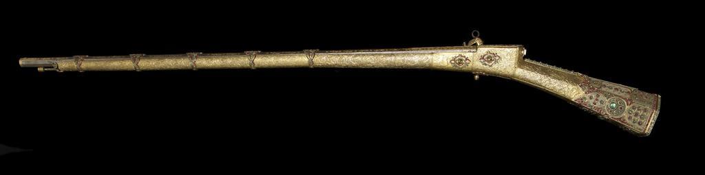 | Keywords: Turkish - Rifle - Walters 5184 - Side A.jpg Referencing the elite pastimes of hunting and writing this ceremonial jeweled rifle set includes a dagger pen case penholder with pen penknife cleaner and a spoon-all conveniently housed within the rifle butt Penknives were important elements in the calligrapher's toolset and their handles were often elaborately decorated The hardness of the reed used for pens throughout Islamic lands required a good blade to make a clean cut The small spoon was used to put black powder into the flash pan in preparation for firing the rifle The imperial monogram tughra of the Ottoman ruler Sultan Mahmud I r 1730-54 is inscribed in diamonds inside the hinged panel of the rifle butt The artist Muhammad and the rifle's owner Ahmad Khan who had possession of the rifle at some point are also named 1732-33 Early Modern rifle steel wood gold gilded silver gilded brass silver nephrite diamonds emeralds rubies or spinels ; dagger steel inlaid with gold rubies and beryls cm 24 8 139 7 7 accession number 51 84 22655 R S Pardo Constantinople date and mode of acquisition unknown Henry Walters Baltimore 1903 mode of acquisition unknown Walters Art Museum Henry Walters Acquired by Henry Walters 1903 Translation on barrel What God wills on flintlock Work of Muhammad; its owner is Ahmad Khan tughra hidden under panel in stock is that of Sultan Mahmud I r 1730-1754 place of origin Turkey Walters Art Museum license Islamic metalwork in the Walters Art Museum Weapons in the Walters Art Museum Art from Turkey Media contributed by the Walters Art Museum needs category review |