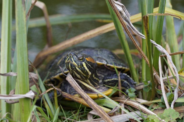 Keywords: turtle water turtle on the shore at the pond on the water hidden