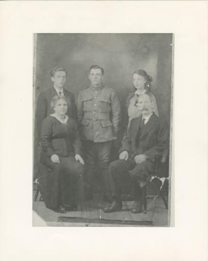 Keywords: first world war firstworldwar ww1 wor life worlife white frame whiteframe black and white photograph blackandwhitephotograph digital image digitalimage social history socialhistory wartime archives portrait copy studio photograph studiophotograph studio room interior army uniform armyuniform military young man youngman boy girl man woman seated standing long dress longdress three-piece suit threepiecesuit regional faces of the first world war regionalfacesofthefirstworldwar wor faces: regional faces of the first world war worfacesregionalfacesofthefirstworldwar world war one worldwarone mysterious interesting unusual fascinating tyne and wear tyneandwear north east of england northeastofengland united kingdom unitedkingdom mark grain floor timber chair neutral background neutralbackground crease tie shirt button pocket leg shoe shine moustache hair attentive trousers clean shaven cleanshaven family family life familylife daily life dailylife home front homefront groupshot people monochrome black and white Photograph, black and white, copied. Studio photograph showing a young man in army uniform standing between a young boy and girl. Man and woman seated in front. The man is wearing a three-piece suit, woman in a long dress Regional Faces of the First World War. The photograph is from an album relating to the men, women and children from Tyne and Wear who lived, worked or fought during the First World War. Accompanying this photo is the biographical and supporting information that we have about them, but the full story is not always known. Our collections records are not very detailed in some cases. We need your help to fill in the blanks. Do you have any information to add to what is already here? A name? A location? What more can you find out and tell us about their life? If you have some extra information about this photograph, please add your comments, information and any links, images or text. Part of the ‘Wor Life’ project. To find out more please visit www.worlife.org.uk Photograph, black and white, copied. Studio photograph showing a young man in army uniform standing between a young boy and girl. Man and woman seated in front. The man is wearing a three-piece suit, woman in a long dress Regional Faces of the First World War. The photograph is from an album relating to the men, women and children from Tyne and Wear who lived, worked or fought during the First World War. Accompanying this photo is the biographical and supporting information that we have about them, but the full story is not always known. Our collections records are not very detailed in some cases. We need your help to fill in the blanks. Do you have any information to add to what is already here? A name? A location? What more can you find out and tell us about their life? If you have some extra information about this photograph, please add your comments, information and any links, images or text. Part of the ‘Wor Life’ project. To find out more please visit www.worlife.org.uk