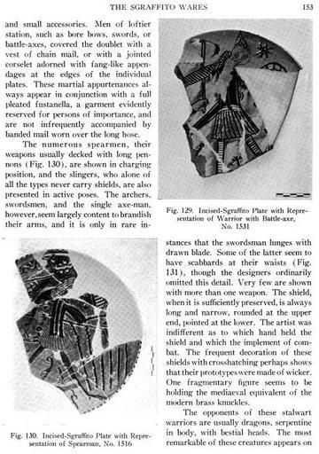 | Keywords: Twelfth Century Sgraffito Warriors2.JPG en Twelfth Century Sgraffito Greek Warriors from Corinth Greece wearing pleated fustanella <ref name Morgan Charles Hill 1942 132-3 > cite book Morgan Charles Hill The Byzantine pottery Cambridge Mass Published for the American school of classical studies at Athens Harvard university press 1942 318 36957616 Fig 129 Similar to No 1507 Interior warrior lacks left arm feet advances to right head in front view wearing pointed cap doublet with hatched sleeves and incised body pleated fustanella and incised cross-gartered hose; he carries a battle axe in his right pointed oval shield with scale pattern in left sheathed sword at waist; his curling hair seems arranged in locks the ends of which are wrapped up; in field various small incised motives Slip on interior Yellow glaze all over A J A XLII 1938 pp 368 f fig 10; Byzantion XV 1941 p 89 </ref> In The Byzantine pottery by Charles H Morgan II pp 153 1942 http //babel hathitrust org/cgi/pt id mdp 39015018611767;view image;q1 Fig 20129;start 1;size 100;page root;seq 179;num 153 HathiTrust Digital Library Morgan Charles Hill PD-old References reflist Pottery sgraffito Fustanella |