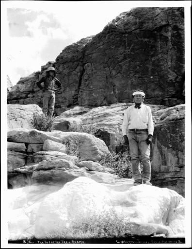 Photograph of two young Acoma Indian men standing at the top of the Acoma Trail, 1886. The trail consists of and is surrounded by large large rocks. The man on the left is wearing a long-sleeved shirt, pants, and a hat. The other man is also wearing a long-sleeved shirt and pants, but he has a white cloth wrapped around his head.