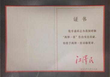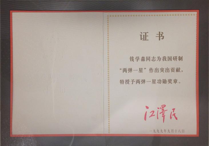 | Keywords: Two Bombs and One Satellite Meritorious Award Certificate of Qian Xuesen.JPG zh-cn 1999年,钱学森获得中共中央 国务院和中央军委颁发的两弹 星功勋奖章 图为江泽民签署的证书原件,现藏上海交 大学徐汇校区钱学森图书馆 en Qian Xuesen received the Two Bombs and One Satellite Meritorious Award granted by the State Council the Central Committee of the Communist Party and Central Military Commission in 1999 In the photo is his certificate signed by Jiang Zemin of which the original copy is owned by Qian Xuesen Library of Shanghai Jiao Tong University 1999-09-18 photo taken on 2015-09-25 16 40 18 zh-cn 上海交 大学徐汇校区钱学森图书馆藏文物 en Original copy owned by Qian Xuesen Library of Shanghai Jiao Tong University zh-cn 中共中央 中华人民共和国国务院 中央军委 other versions 31 203083333333 121 43061944444 heading 351 6580310880829 Custom license marker 2015 09 25 PD-PRC-exempt Qian Xuesen Calligraphy by Jiang Zemin Qian Xuesen Library Shanghai |