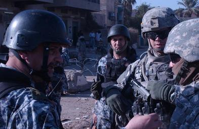 Keywords: Two-day Security Mission in Sadr City Another Step Forward in the Plan for DVIDS37488.jpg en 1st Lt Jacob Czekanski an infantry officer from Silver Creek Mich with 3rd Platoon Blackhawk Company 1st Battalion 23rd Infantry Regiment meets with an Iraqi leader and interpreter in Sadr City March 5 before clearing houses and speaking with locals to better understand the ground situation in the area U S Army photo by Pfc M Benjamin Gable 7th Mobile Public Affairs Detachment 2007-03-05 https //www dvidshub net/image/37488 37488 2007-03-09 06 48 BAGHDAD IQ PD-USGov 23rd Infantry Regiment United States Images from DoD uploaded by Fæ