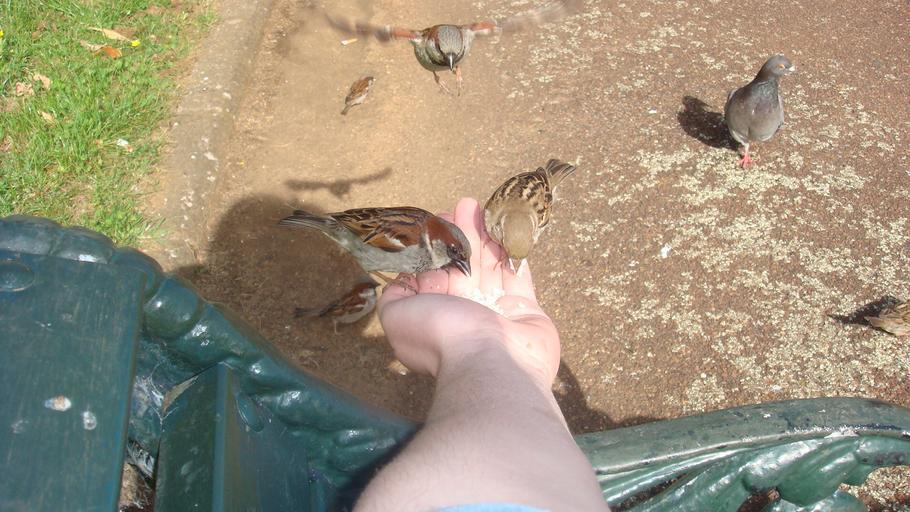 | Keywords: Two House Sparrows (Passer domesticus) feeding from hand.JPG in flight at the top of the image They are feeding on oatmeal while other House Sparrows and a Rock Pigeon Columba livia stand on the ground below them Sparrows and pigeons are the most friendly birds at the park though others like Mynas or Blackbirds will also take food if it's on offer It's not common for a House Sparrow to fly up and eat out of your hand in my experience but they were doing it at this time and place quite reliably A female was even making very regular trips to collect oats and then feed her begging offspring Own Richard001 2008-11-21 -36 850406 174 767944 region NZ Passer domesticus flocks Feral pigeons Passer domesticus in flight male Albert Park Auckland Human hands holding birds Passer domesticus eating Oatmeal Original uploads by User Richard001 Feeding animals |