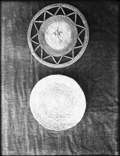 | Keywords: wikimedia commons wikimediacommons images_from_usc_digital_library_uploaded_by_fæ imagesfromuscdigitallibraryuploadedbyfæ california_historical_society_collection,_1860-1960 californiahistoricalsocietycollection18601960 glass_plate_negatives glassplatenegatives native_american_baskets nativeamericanbaskets photographs_by_george_wharton_james photographsbygeorgewhartonjames blackandwhite monochrome round texture indoor black and white Wikimedia Commons image page Description Description ''Two unidentified Indian baskets on display, ca.1900 Photograph of a collection of 2 unidentified Indian baskets on display, photographed ca.1900. They are displayed against a dark cloth. One is flat and disk-shaped with a spiral weave. The other is more ornate, having the image of a twig with three leaves in the middle and openings around a zig-zag pattern surrounding the central portion. Photographer: James, George Wharton Filename: CHS-3968 Coverage date: circa 1900 Part of collection: California Historical Society Collection, 1860-1960 Type: images; physical objects Part of subcollection: Title Insurance and Trust, and C.C. Pierce Photography Collection, 1860-1960 Repository name: USC Libraries Special Collections Format: glass plate negatives Archival file: chs_Volume96/CHS-3968.tiff Repository address: Doheny Memorial Library, Los Angeles, CA 90089-0189 Geographic subject (country): USA Format (aacr2): 1 photograph : glass photonegative, b&amp;w ; 22 x 17 cm. Rights: Digitally reproduced by the USC Digital Library; From the California Historical Society Collection at the University of Southern California Call number: CHS-3968 Accession number: 3968 Repository email: specol@usc.edu Contributing entity: California Historical Society Date created: circa 1900 Publisher (of the digital version): University of Southern California. Libraries Format (aat): photographs Legacy record ID: chs-m16500 Access conditions: Send requests to address or e-mail given. Phone (213) 821-2366; fax (213) 740-2343. Subject (lcsh): Indians of North America; Indians of North America -- Industries; Baskets; Indians of North America -- Basket making Subject: Indians -- Arts and crafts -- Basketry; Indian Basketry Date circa 1900 (date created) Author James, George Wharton Source http //digitallibrary.usc.edu/cdm/ref/collection/p15799coll65/id/16438 }} License {{PD-old-70-1923}} Images from USC Digital Library uploaded by Fæ California Historical Society Collection, 1860-1960 Glass plate negatives Native American baskets Photographs by George Wharton James Wikimedia Commons image page Description Description ''Two unidentified Indian baskets on display, ca.1900 Photograph of a collection of 2 unidentified Indian baskets on display, photographed ca.1900. They are displayed against a dark cloth. One is flat and disk-shaped with a spiral weave. The other is more ornate, having the image of a twig with three leaves in the middle and openings around a zig-zag pattern surrounding the central portion. Photographer: James, George Wharton Filename: CHS-3968 Coverage date: circa 1900 Part of collection: California Historical Society Collection, 1860-1960 Type: images; physical objects Part of subcollection: Title Insurance and Trust, and C.C. Pierce Photography Collection, 1860-1960 Repository name: USC Libraries Special Collections Format: glass plate negatives Archival file: chs_Volume96/CHS-3968.tiff Repository address: Doheny Memorial Library, Los Angeles, CA 90089-0189 Geographic subject (country): USA Format (aacr2): 1 photograph : glass photonegative, b&w ; 22 x 17 cm. Rights: Digitally reproduced by the USC Digital Library; From the California Historical Society Collection at the University of Southern California Call number: CHS-3968 Accession number: 3968 Repository email: specol@usc.edu Contributing entity: California Historical Society Date created: circa 1900 Publisher (of the digital version): University of Southern California. Libraries Format (aat): photographs Legacy record ID: chs-m16500 Access conditions: Send requests to address or e-mail given. Phone (213) 821-2366; fax (213) 740-2343. Subject (lcsh): Indians of North America; Indians of North America -- Industries; Baskets; Indians of North America -- Basket making Subject: Indians -- Arts and crafts -- Basketry; Indian Basketry Date circa 1900 (date created) Author James, George Wharton Source http //digitallibrary.usc.edu/cdm/ref/collection/p15799coll65/id/16438 }} License {{PD-old-70-1923}} Images from USC Digital Library uploaded by Fæ California Historical Society Collection, 1860-1960 Glass plate negatives Native American baskets Photographs by George Wharton James <b> <a href="http://commons.wikimedia.org/wiki/File:Two_unidentified_Indian_baskets_on_display,_ca.1900_(CHS-3968).jpg" rel="nofollow">Wikimedia Commons image page</a></b>