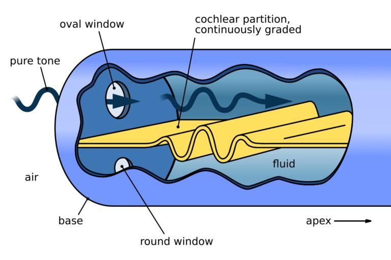 | Keywords: Two views of cochlear mechanics (A).svg en The cochlea shown uncoiled is filled with liquid In the accepted travelling wave picture shown here the partition vibrates up and down like a flicked rope and a wave of displacement sweeps from base high frequencies to apex low frequencies Where the wave broadly peaks depends on frequency Own Inductiveload 2009-04-18 Alternative mechanic Both together Anatomy Fluid mechanics SVG files on inner ear SVG files on otology Sensory Neuroscience Hearing and speech |
