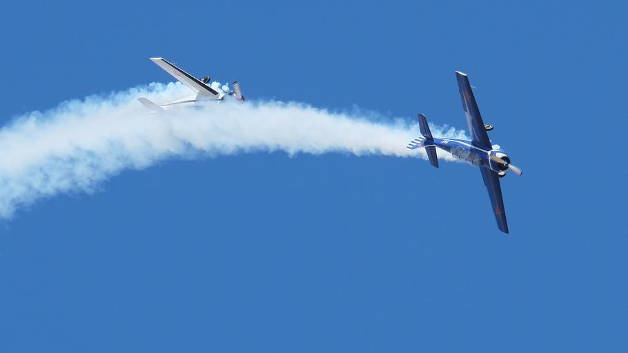 | Keywords: Two Yak-52s chasing each other through a looping.jpg Two Yak-52s chasing each other at the top of a looping with smoke trails Yakovlev Yak-52 ZK-PTE ZK-YAK Private Red Star Aerobatic Team Photograph Hood Aerodrome Masterton New Zealand 2015-01-17 Pseudopanax wikipedia en Own 40 58 0 S 175 40 0 E Yakovlev Yak-52 Wings over Wairarapa 2015 Aircraft in flight Smoke trails of aerobatic teams | ||||