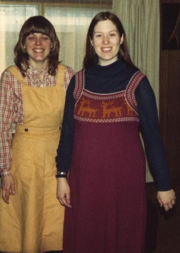 Keywords: Twostand.jpg At left a yellow dungaree skirt worn over a check shirt At right a purple jumper dress or pinafore dress worn over a black top 2007-02-13 own assumed Ursnaq Personality rights Portraits of adolescent girls Jumper dresses 20th-century fashion Women smiling while standing Yellow skirts Purple dresses