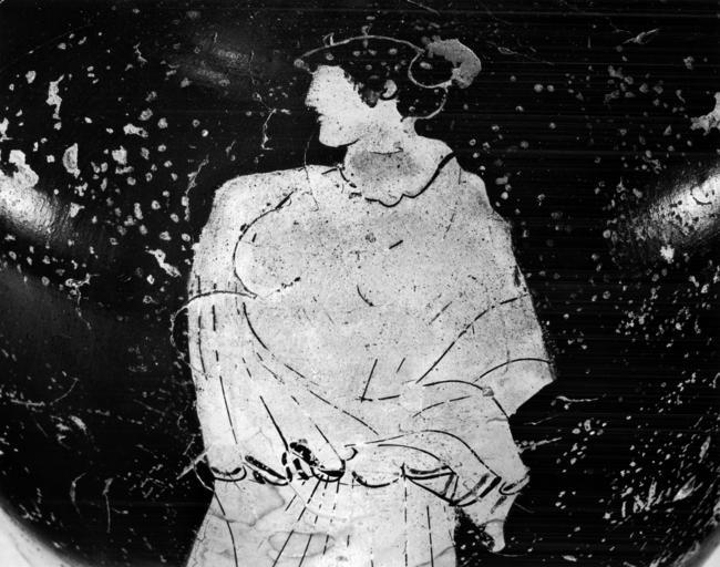 | Keywords: Tyszkiewicz Painter - Small Neck-Amphorae - Walters 4858 - Side B Detail.jpg This amphora depicts a bearded mantled man on the front He is leaning over and resting on a staff to the right His head is lowered and he holds out a necklace or wreath in his hands for the woman on the back The paint for the object he holds is lost but the preliminary sketch indicates it was there or intended A woman on the back wears a chiton and mantle and stands to the left Her right arm is hidden underneath her drapery but her left hand and arm although covered by drapery can be perceived at her side Her hair is tied up in a bun at back Her pose with shoulders straight suggests that she is attentive to the offering of the man on the front ca 480 BC Classical terracotta H 12 11/16 x Max Diam 8 1/16 in 32 3 x 20 4 cm ; Diam at rim cm 14 6 ; Diam at foot cm 11 3 accession number 48 58 33313 Don Marcello Massarenti Collection Rome date and mode of acquisition unknown Henry Walters city Baltimore Walters Art Museum Henry Walters Acquired by Henry Walters with the Massarenti Collection 1902 place of origin Attica Greece Walters Art Museum license Ancient Greek red-figure pottery in the Walters Art Museum Tyszkiewicz Painter Media contributed by the Walters Art Museum needs category review Media contributed by the Walters Art Museum needs artist update |
