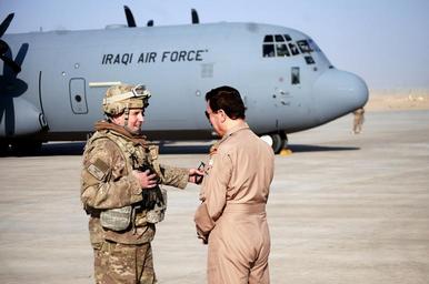 Keywords: U.S. Air Force Col. Rhett Champagne speaks with the chief of staff of the Iraqi air force at Q-West Airfield.jpg en U S Air Force Col Rhett Champagne left commander 821st Crisis Response Group speaks with the chief of staff of the Iraqi air force upon the landing of his C-130J Super Hercules at Qayyarah West Airfield Iraq Oct 30 2016 This was the first time a fixed wing aircraft from the Iraqi security forces landed at Qayyarah West Airfield since the base was occupied by Islamic State of Iraq and the Levant in 2014 Coalition forces reconstructed the airfield as part of their effort to assist the Iraqi security forces as the seize territory from ISIL The Qayyarah West Airfield serves as a logistics hub for ongoing operations in northern Iraq U S Army photo by 1st Lt Daniel Johnson 2016-10-29 20 00 00 https //www dvidshub net/image/2954356/iraqi-air-force-lands-qayarrah U S Army photo by 1st Lt Daniel Johnson other versions PD-USGov Qayyarah Airfield West |