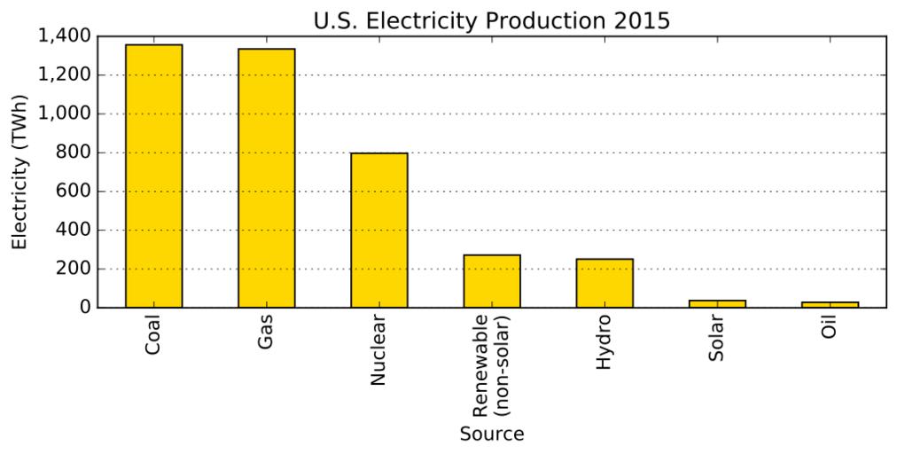 Keywords: U.S. Electricity Production 2015.svg en A graph showing U S energy production for the year 2015 Data from the https //www eia gov/electricity/monthly/epm_table_grapher cfm t epmt_1_01 U S Energy Information Administration 2016-11-23 own Douglas Perkins other versions The SVG file was produced using MatPlotLib with the following also Public Domain code <pre> /usr/bin/env python from matplotlib import pyplot from matplotlib import ticker from matplotlib import numpy This generates a bar graph showing the U S 's electricity production in 2015 https //www eia gov/electricity/monthly/ https //www eia gov/electricity/monthly/epm_table_grapher cfm t epmt_1_01 This file was written by Douglas Perkins It is released under a Creative Commons Zero 1 0 license https //creativecommons org/publicdomain/zero/1 0/ Renewable energy production in TWh petroleum_liquids 17 456 petroleum_coke 10 987 petroleum petroleum_liquids + petroleum_coke Energy production in TWh data Coal 1356 057 Gas 1335 068 Nuclear 797 178 Renewable\n non-solar 271 885 Hydro 251 168 Solar 37 371 Oil petroleum sources d0 for d in data amounts d1 for d in data A formatter to display comma-separated numbers on the y axis def comma_func x pos s ' 0 d ' format int x return s comma_format ticker FuncFormatter comma_func Make a bar graph x numpy arange len sources + 0 25 width 0 5 pyplot figure num 1 figsize 9 3 pyplot title U S Electricity Production 2015 pyplot bar x amounts width color 'gold' pyplot xlabel 'Source' pyplot ylabel 'Electricity TWh ' yticks pyplot xticks x + width/2 0 sources pyplot xticks rotation 'vertical' pyplot subplot 111 yaxis set_major_formatter comma_format pyplot subplot 111 grid b True axis 'y' pyplot savefig 'Chapter 7 US Electricity Production 2015 svg' format 'svg' bbox_inches 'tight' </pre> cc-zero Energy statistics of the United States |