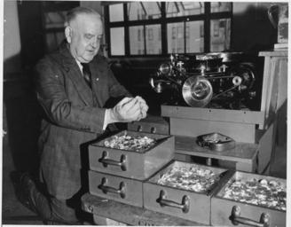 Keywords: U.S. Mint at Frisco Makes Coins for China - NARA - 296602.jpg Scope and content For two months employees of the San Francisco Federal Mint worked behind the bullet-proof enclosuresmaking more than 10 million coins for the Chinese government After the mint in Shanghai closed the Chinese sent 150 tons of silver and copper alloys to San Francisco so that the money could be made More than 3 000 000 dollars and twice as many half-dollars were ordered The photograph shows Peter J Haggerty Superintendent of the Mint looking over part of the production of Chinese coins General notes 296602 Local identifier Department of the Treasury Bureau of the Mint U S Mint San Francisco California 1873 - 07/11/1962 NARA's Pacific Region San Bruno NRHAS 1000 Commodore Drive San Bruno CA 94066-2350 1998-06-25 Record group Record Group 104 Records of the U S Mint 1792 - 2007 Record group ARC 433 Photographs of Mint Operations compiled ca 1885 - ca 1938 Series ARC 296601 File unit File unit ARC Variant control numbers NAIL Control Number NRHS-104-SFMNTMINTOPS-SF454319 Other versions <gallery> File U S _Mint_at_Frisco_Makes_Coins_for_China_-_NARA_-_296602 tif tif File U S _Mint_at_Frisco_Makes_Coins_for_China_-_NARA_-_296602 jpg jpg </gallery> NARA-cooperation PD-USGov Coins of China New United States Mint San Francisco