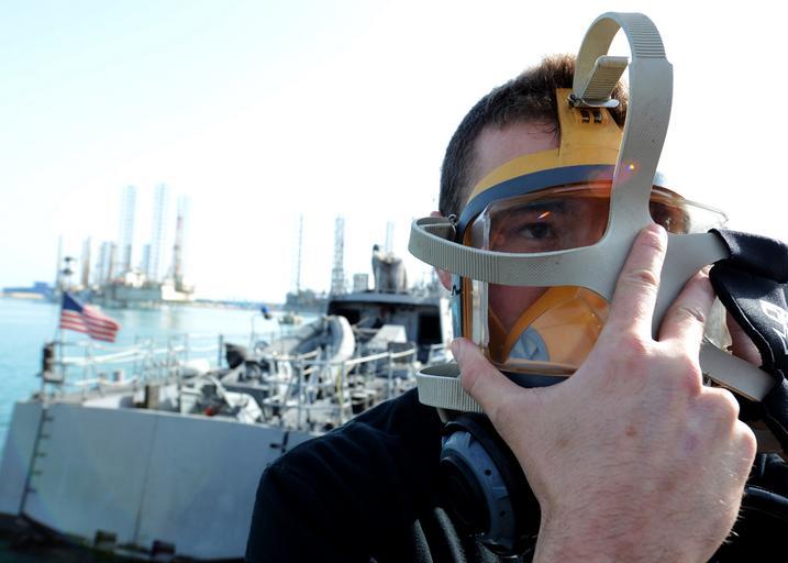 | Keywords: U.S. Navy Petty Officer 2nd Class Gabriel Shelton, assigned to Explosive Ordnance Disposal Expeditionary Support Unit (EODESU) 2, performs a communications check on a MK 20 underwater breathing apparatus prior 110307-N-LO372-052.jpg  en U S Navy Petty Officer 2nd Class Gabriel Shelton assigned to Explosive Ordnance Disposal Expeditionary Support Unit EODESU 2 performs a communications check on a MK 20 underwater breathing apparatus prior to going into the water to repair a screw propeller on coastal patrol warship USS Firebolt PC-10 during the ship's husbandry dive in Mina Salman Bahrain March 7 2011 EODESU-2 is deployed with Commander Task Group 56 1 supporting maritime security operations and theater security cooperation efforts in the U S 5th Fleet area of responsibility 2011-03-07 MC1 Elisandro Diaz http //www defenseimagery mil/imageRetrieve action guid 6c80b6956f1b4010dfe171b5043d6c97cdb8e5a5 t 2 Public domain photograph from defenseimagery mil http //www defenseimagery mil/imagery html guid 6c80b6956f1b4010dfe171b5043d6c97cdb8e5a5 110307-N-LO372-052 2011-08-17 Mina Salman PD-USGov-Military-Navy Images from DoD uploaded by Fæ Underwater diving equipment USS Firebolt PC-10 Full face diving masks |