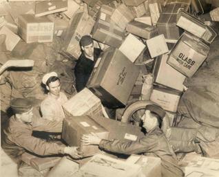 Keywords: smithsonian institution smithsonianinstitution world war 2 worldwar2 sailor mail package shipping pile brown sepia box navy armed forces armedforces gift u.s. troops ustroops parcels commons:collection=christmas wwii holiday white hat whitehat family love postal service soldiers uniforms men buried towerin boxes christmas work working cajas correo segunda guerra mundial withcare commons:event=commonground2009 chaos post war history warhistory sailors handle with care handlewithcare black and white blackandwhite military food military mail delivery militarymaildelivery ww2 mail drop maildrop 1944 holiday mail holidaymail u.s troop ustroop packages national postal museum nationalpostalmuseum deluge commons mail across the commons mailacrossthecommons christmas across the commons christmasacrossthecommons black and white Description: U.S. troops almost buried by parcels do their best to handle that year's holiday mail. Creator/Photographer: Unidentified photographer Medium: Black and white photographic print Culture: American Geography: USA Date: c. 1944 Persistent URL: arago.si.edu/index.asp?con=2&cmd=1&id=203578 Repository: National Postal Museum Collection: U.S. Military Mail Accession number: A.2008-51 Description: U.S. troops almost buried by parcels do their best to handle that year's holiday mail. Creator/Photographer: Unidentified photographer Medium: Black and white photographic print Culture: American Geography: USA Date: c. 1944 Persistent URL: arago.si.edu/index.asp?con=2&cmd=1&id=203578 Repository: National Postal Museum Collection: U.S. Military Mail Accession number: A.2008-51