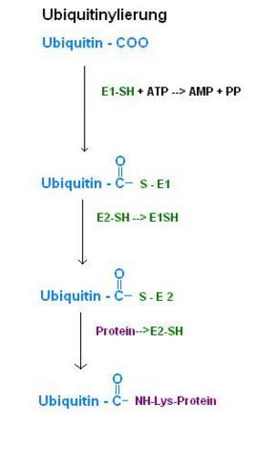 | Keywords: Ubiquitinylierung.JPG A scheme showing the mechanism ubiquitation I made it myself with MS paint Adopted with slight changes from Stryer Lubert Biochemie Spektrum Akad Verlag Heidelberg Berlin Oxford 1996 2006-08-25 own assumed Nasiruddin Post-translational modifications Protein degradation |