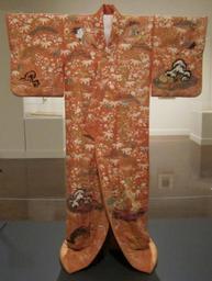 | Keywords: Uchikake, early 18th century, silk, gilt-paper wrapped threads, damask weave, yuzen stencil-printed embroidery, Honolulu Museum of Art.JPG en Bridal outer robe uchikake from Japan early 18th century silk gilt-paper wrapped threads damask weave yūzen paste resist hand painted stencil-printed embroidery Honolulu Museum of Art own Hiart photo 2013 Yūzen Uchikake Kimono in the Honolulu Museum of Art Embroidery from Japan Cc-zero Painted textiles | ||||