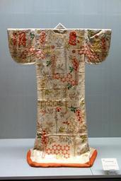 | Keywords: Uchikake (garment with long hanging sleeves), view 1, Edo period, 18th century, hexagonal pattern, wisteria, and character design on white figured satin ground - Tokyo National Museum - DSC06009.JPG en Exhibit in the Tokyo National Museum Tokyo Japan This artwork is old enough so that it is in the public domain 2013-09-03 00 26 51 own Daderot cc-zero Uchikake in the Tokyo National Museum Uploaded with UploadWizard | ||||